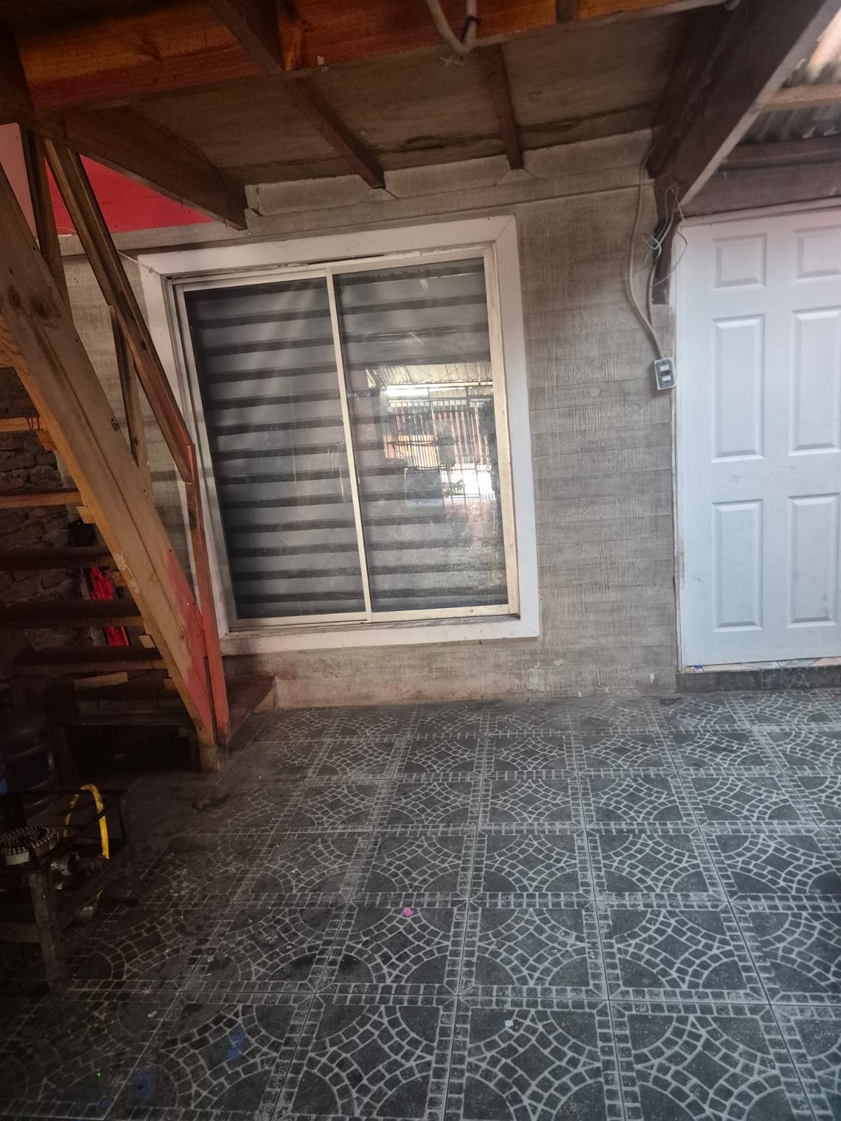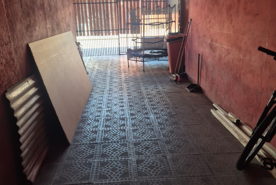 Patio con pasillo lateral techado, vigas a la vista